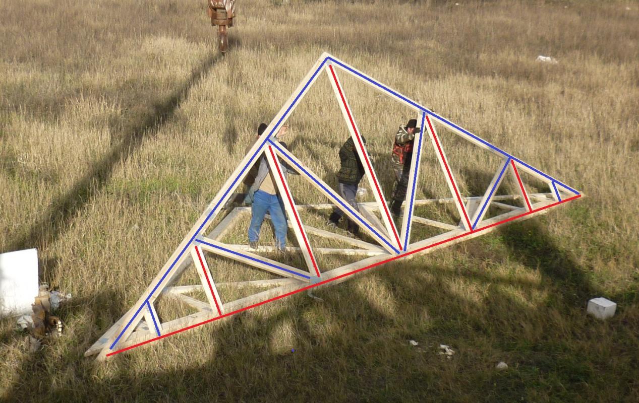 Не-не-не. Совсем не так. Ферма стержневая конструкция. Это могут быть прутки, уголки, доски, что угодно. Вот эти стержни связываются между собой узлами. Все узлы это шарниры. А все стержни это сжатые или растянутые элементы. Нагрузку на ферму передают сосредоточенными силами только в узлы. Ну как ее передавать например, на арматурный стержень? Согнется же, а вот в узел можно. В этом узле, например, сходятся три стержня, два из них будут работать на сжатие (лучше уголки поставить или деревяшку) а один на растяжение (можно арматурный пруток оставить). Ну или наоборот, два стержня растянутых один сжат. Неважно, это от конкретной фермы зависит. Главное, что никто не работает на изгиб, а значит можно применять для стержней маленькие сечения.