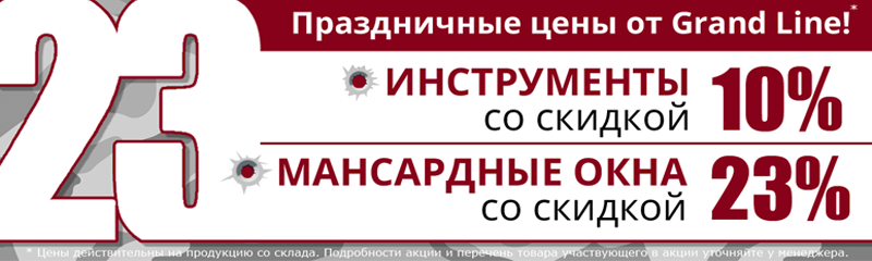 В преддверии Дня защитника Отечества приобретайте инструмент и мансардные окна, по специальной цене в фирменных офисах и Интернет-магазине Grand Line!* 1. Скидка 10% на инструменты Grand Line, Malco, Stubai, EDMA: - для водоcтока для ГК-профиля - для ограждений - для сайдинга - киянки, молотки, оправки - клещи, инструмент для конвертов - ножницы ручные - рамки, ручные листогибы - насадка-ножницы Стальной бобер для резки металла 2. Скидка 23% на мансардные окна Velux!** Подробности уточняйте у в офисах продаж * - цены действительны на продукцию со склада ** - скидка на окна распространяется только в ЦФО Акция действует в период с 19.02.16 по 11.03.16. |