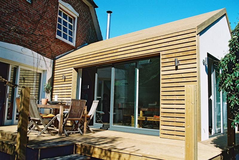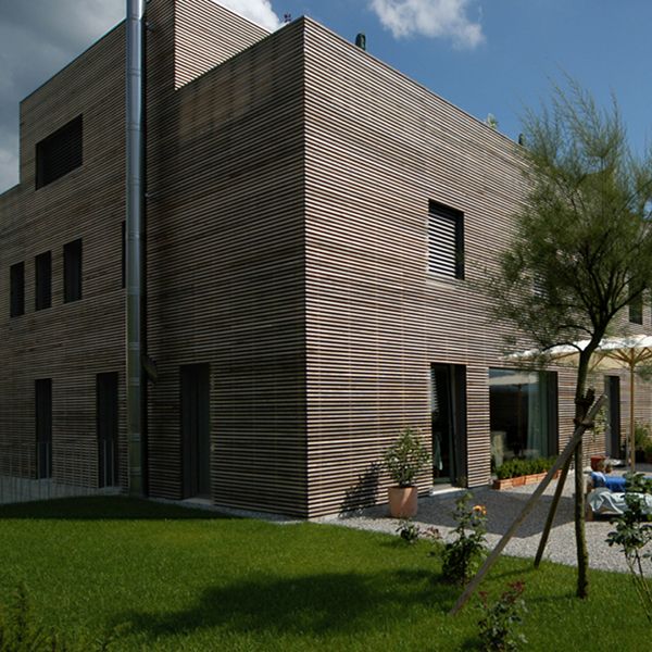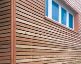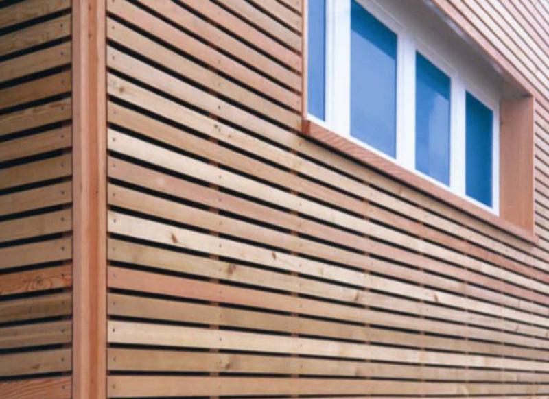 Прекрасно смотрятся фасады из деревянных ламелей, установленных с зазорами.