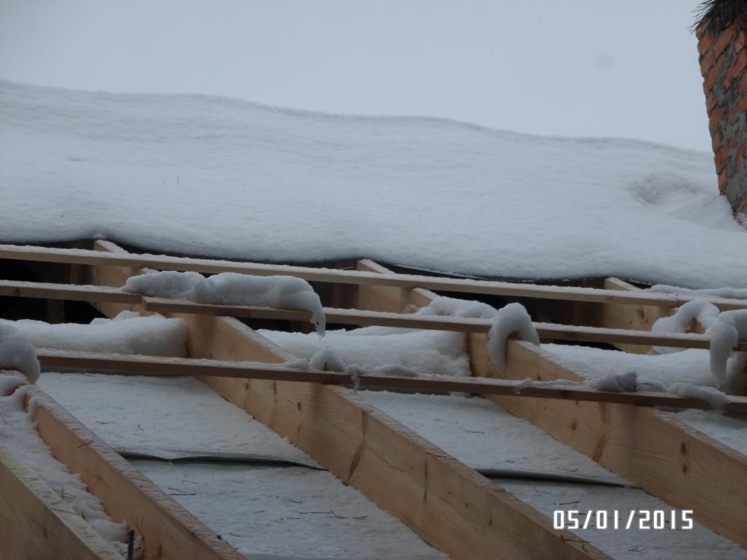Маленькая хитрость. Когда укладываете парик - оставляйте края полотен несклеяными со щелью см 15 - тогда снег перед укладкой утеплителя не придётся сгонять до карниза, а когда гидрашкой накроетесь - тогда и проклеите и поддерживающие доски недостающие добавите.