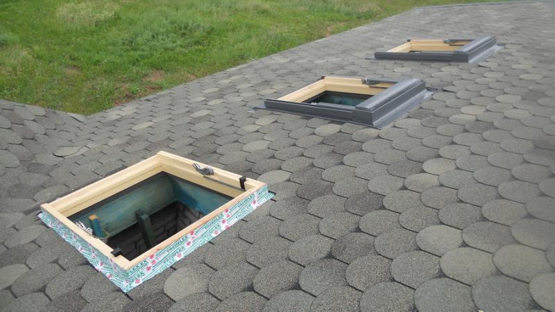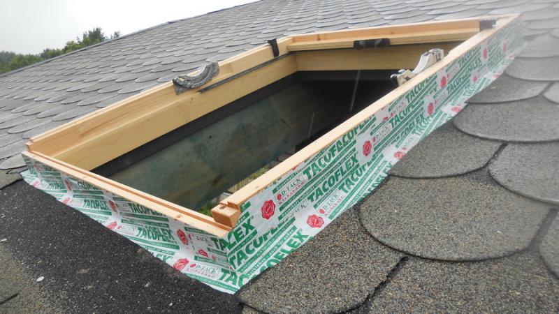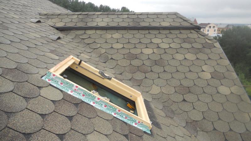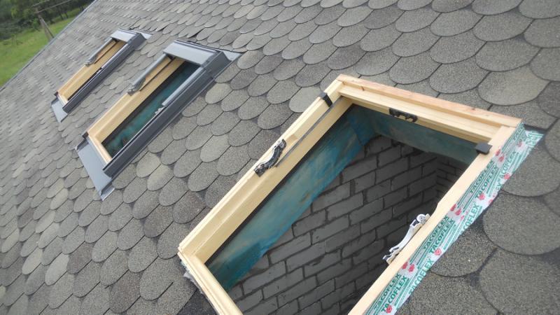 Замотали сегодня 6 окон Велюкса Такофлексом. Показываю пример как ставятся окна в готовые предварительные вырезанные дыры в скатах с учетом несвоевременной поставки окон. Вначале заколотили гонты и только позже врезали окна. Проблем по установке нет, кроме дополнительных трудопотерей.