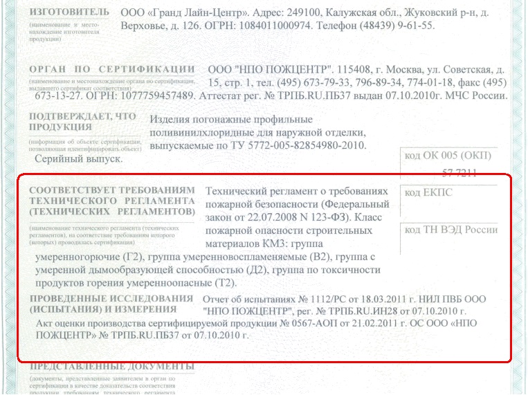 То, что в России есть нормативы по испытанию на соответствие нормам пожаробезопасности (сейчас не будем обсуждать, насколько они адекватны), нам известно хотя бы потому, что иметь такой сертификат мы просто обязаны по закону. Кстати, у всех российских производителей сайдинга из ПВХ будет ровно то же - КМ3, Г2, В2, Д2, Т2, поэтому высказывание про "хлорвинил зело токсичен" неверное.
