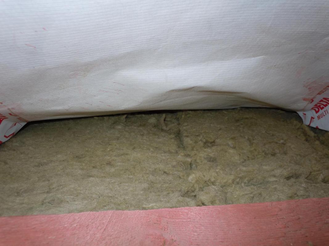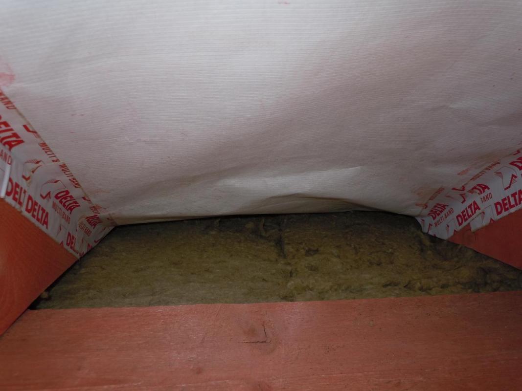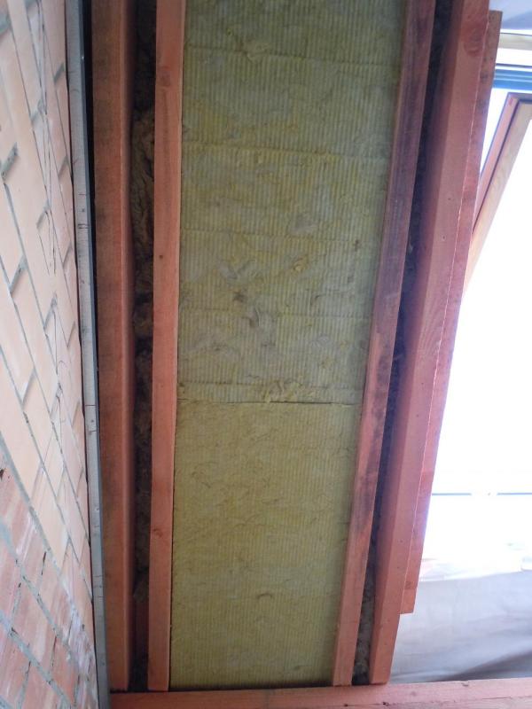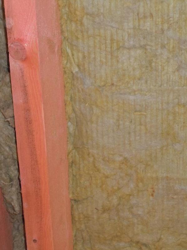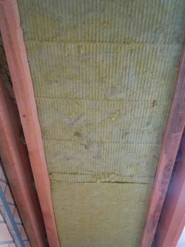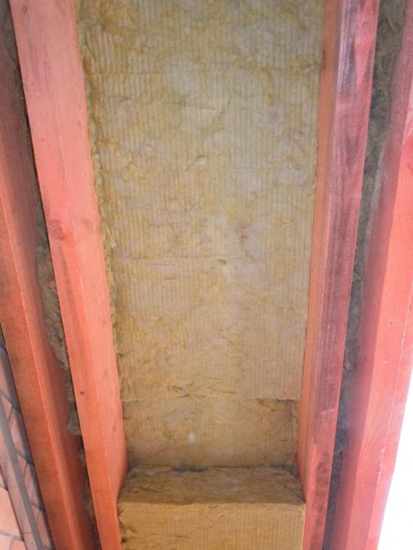 Еще хочу поделиться своим наблюдением и, пусть небольшим, но все-таки первым опытом работы с ватой. Для тех, кто этого еще ни разу не делал. Если работаете на скатной кровле плотным утеплителем (у меня Изорок 10см пл. 50), не берите +2см к межстропильному расстоянию. Это много. Не более +1см. Иначе его о-о-о-чень трудно запихивать между стропил и, что хуже, края очень сильно подминаются. Я брал +1см с расчетом, что при отрезании получается еще меньше. В итоге получалось +0,7-0,8см. Он плотно входит, хорошо прилегает к стропилам и не падает, как видно. На фото результаты первых ошибок.
