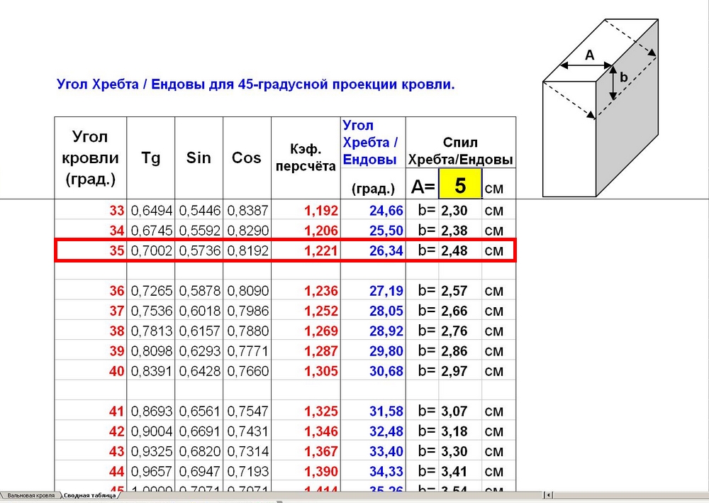 Но всёравно - Спасибо за оценку скромных потугов.... Кстати - если в жёлтую клетку подставить единицу, то получим таблицу для Tg угла хребта/ендовы.... А это означает , что угол спила хребтовой стропилины и угол наклона самого хребта - это один и тотже угол. Такая вот ситуёвина.. |