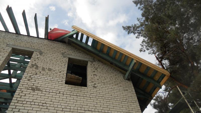 На кирпичных домах выпускают не только стропильные ноги, но и фронтальные прогоны. Согласно нового СП по Кровлям без доп.ноги допускается выпуск обрешетки не более 600 мм. Если карниз свыше 600 мм, применение доп.ноги и консольных прогонов ОБЯЗАТЕЛЬНО.