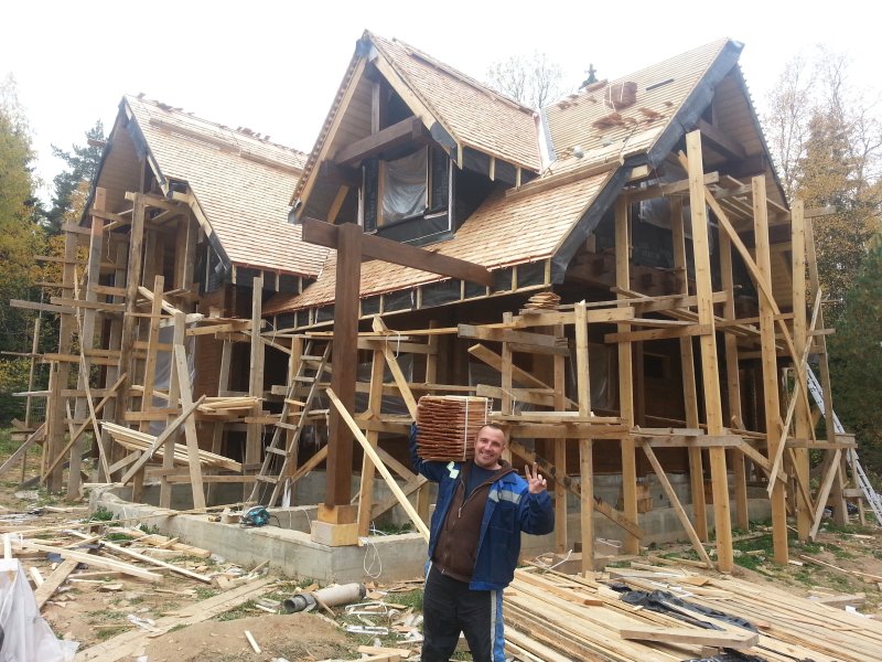 При усадке сруба, нужно учитывать некоторые детали на крыше из битумной черепицы. Такие как обход труб коврами разными, ендова, примыкание к стенам. Их просто рвет эта усадка. Лучше дела обстоят под битумкой- это простая двускатная крыша без трубы ( пока не сядет дом).