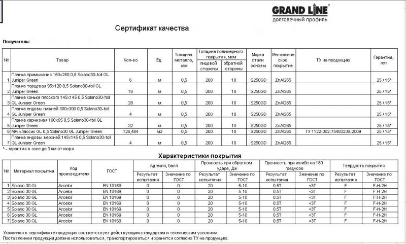 Сертификат комбината Северсталь, ссылку на который разместил ПЕНЗАТАЙЛ ( http://www.vashdom-pnz.ru/ ), не принадлежит заводу Grand Line. Убедиться в этом можно, прочитав графу "Грузополучатель", где указана компания "Металлцентр", г. Пенза. Вся продукция под торговой маркой Grand Line® изготавливается из стали толщиной 0,5мм со слоем цинка не менее 180 г/кв.м. Для того чтобы убедиться в соответствии реальных характеристик изделия заявленным, клиент всегда может получить Сертификат качества (о котором я писал ранее), где указаны толщина стали, толщина цинкового слоя, результаты испытаний Лаборатории качества Grand Line®.