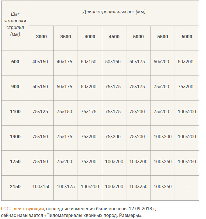 Шаг установки стропил зависит от сечения используемой доски (бруса) и длины стропильного элемента, так же расчетной величины нагрузок для данного региона. Данные, представленные в таблице, не заменяют полноценного расчета несущей способности стропильной системы, их можно рассматривать как рекомендательные для достаточно простых кровель. В таблице даны значения, соответствующие возможным максимальным нагрузкам на стропильную конструкцию для среднеевропейской зоны. Также данные таблицы подготовлены с учетом ассортимента пиломатериалов, которые выпускают российские предприятия, согласно ГОСТ 24454-80 (Необработанная древесина).