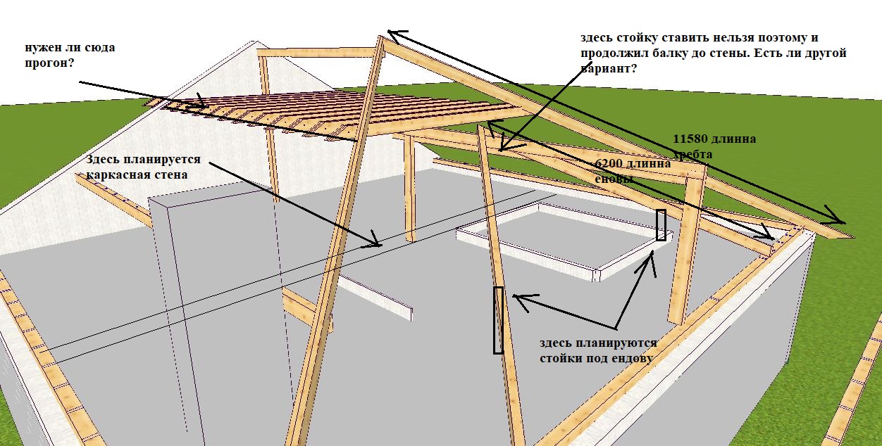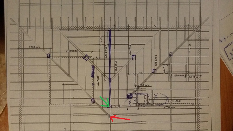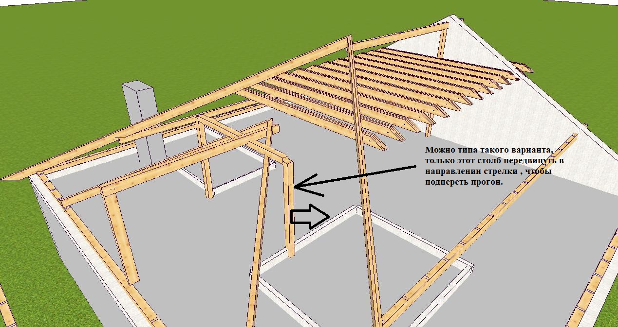 Я немного другое имел ввиду. Вот красным показал. На что в данном месте будет опираться основной прогон? Вы показали что вот по зеленой стрелке есть возможность поставить стойку. Может проще отойти от углов и перенести немного основной узел в зеленую точку и опереть коньковой прогон. Зато потом можно уже нагрузки вешать на эту основу и попробовать уйти от стойки в кукушке