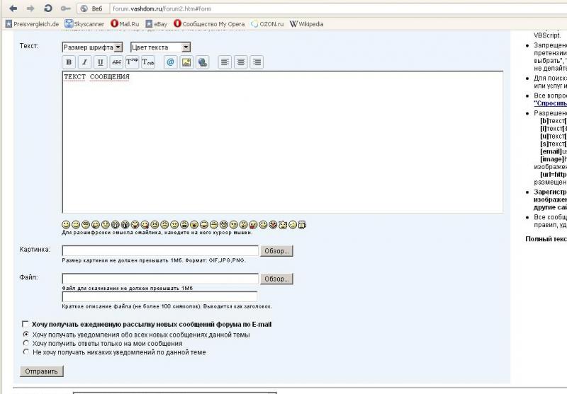 1. Зарегистрироваться 2. Открыть указаную выше страницу.... http://forum.vashdom.ru/forum2.htm 3.Нажать мышкой ...Добавить тему (фото1 слева....под портретом 4.Написань сообщение в поле текст (самое большое окно)......Ниже под окном..... Картинка: ____________________ Обзор 5. Нажать Обзор - Выбрать картинку со своего компа 6.Нажать Отправить Удачи.... |
