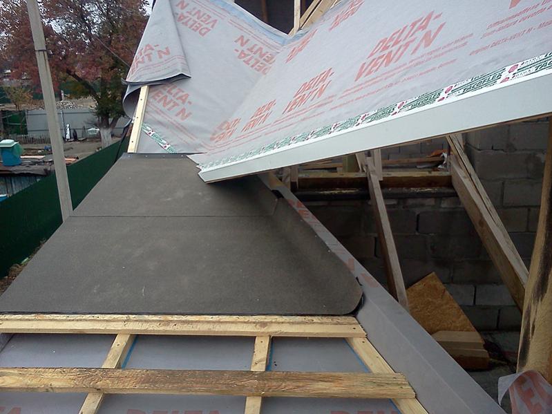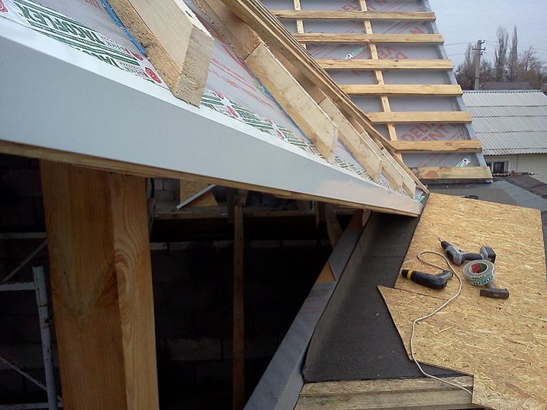 Речь не об обрешетке. Под эту доску в стропильных ногах вырезались пазы, глубиной 25 мм (толщина доски). В итоге верхняя граница доски совпала с плоскостью стропил. (спасибо DRAGOFOLу за узлы). Проклеил скотчем.