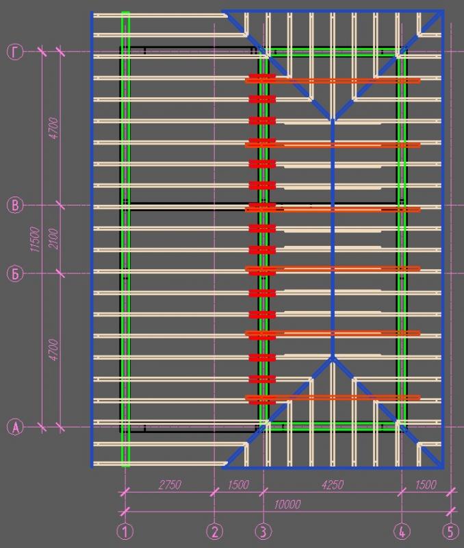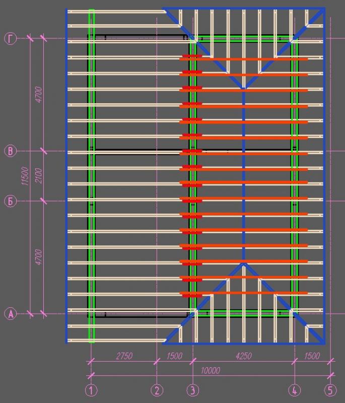 Выходит, у меня осталось 2 варианта. Либо я делаю затяжки над мауэрлатом на каждой паре стропил и отказываюсь от высокого потолка и антресоли, либо я все же пробую эти затяжки "проредить", чтобы осталась возможность устроить небольшую антресоль. Тогда между нижними затяжками получается шаг 2м. Не слишком большой? |