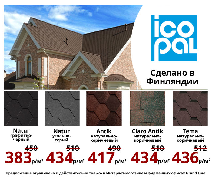 Кстати, у нас стартовала акция на Финскую кровлю Icopal со складов Grand Line! В рамках акции мягкая кровля Icopal доступна по специально цене: - Мягкая черепица "Natur" графитно-черный 383 руб/кв.м. - Мягкая черепица "Natur" угольно-серый 434 руб/кв.м. - Мягкая черепица "Antik" натурально-коричневый 417 руб/кв.м. - Мягкая черепица "claro Antik" натурально-коричневый 434 руб/кв.м. - Мягкая черепица "Tema" натурально-коричневый 436 руб/кв.м. Торопитесь, количество товара ограничено! |