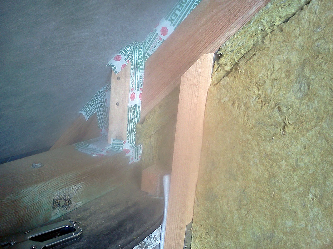 Это отдельные фрагменты пленки, по верхнему краю приклеенные скотчем к внутренней стороне стропил, а снизу к стене (по аналогии с мауэрлатом - защита утеплителя со стороны улицы), кроме того снаружи стропил планирую перекрыться полоской полиэстирола (фото места чуть позже).