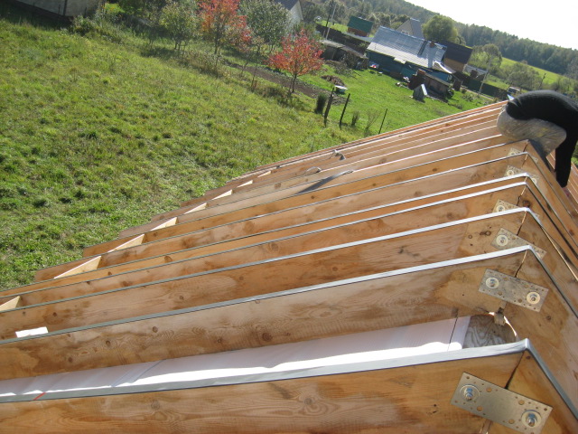 На одном крыле у рабочих съехала линия крепления саморезов. И получилось, что у двух листов посередине саморезы закреплена в 5 или менее 5 мм от края доски, где-то саморезы закручены под углом.... видимо они это обнаружили и под последний лист набили еще обрешетки, чтоб нормально крепить. |