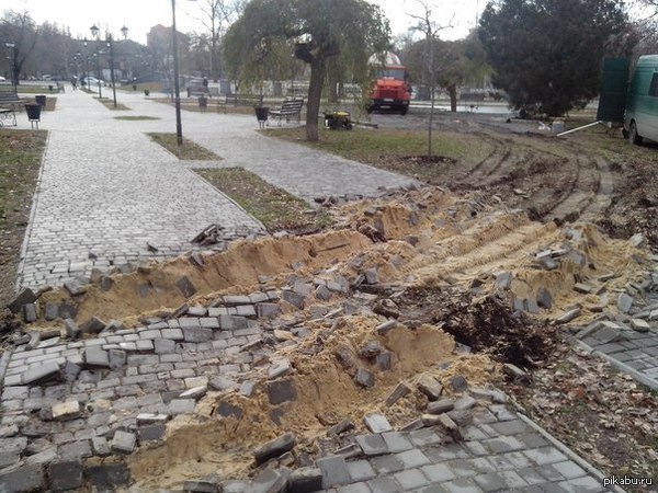 Вот нашел фото из раздела "сначала сделаем все внутренние работы а потом крышу и высотные". Не раз сталкивался когда миксер или вышка перемалывает свежий 2-х сантиметровый асфальт, хотя просили подождать