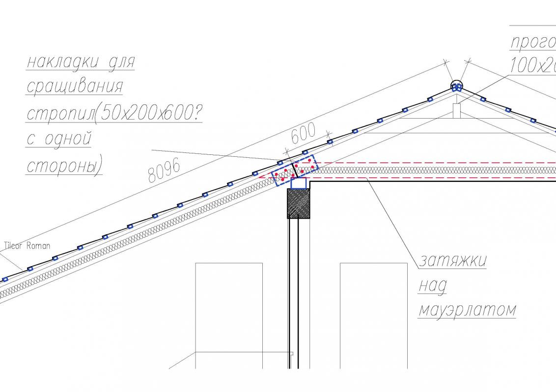 Но пока еще многое остается не понятным, мне хотелось бы задать еще массу вопросов. Вот, например, не понимаю, как лучше срастить стропила. По длинному скату стропильные ноги получаются больше 8 м длиной, брус можно купить только до 6 м. Сращивать рекомендуют в зоне опирания. В интернете я нашла картинку, как сращивают стропила с помощью накладок с двух сторон. Но как раз в зоне опирания будут находиться затяжки. Как быть? Крепить затяжки к накладкам? Или поднимать затяжки? |