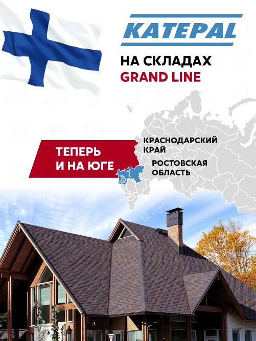 Рады сообщить, что теперь битумная черепица Katepal в наличии на складах Grand Line, в Краснодаре (пгт. Ильский) и Ростове-на-Дону. Преимущества:
