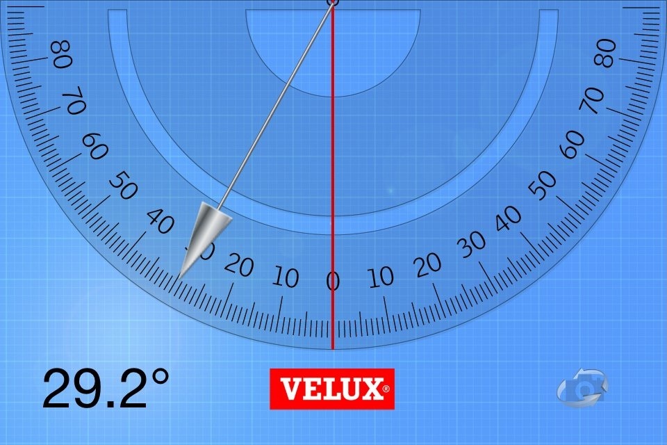 Если вы используете iPhone, вы можете скачать себе мобильное приложение VELUX для измерения угла наклона крыши. Приложение разработано нашими китайскими коллегами Ищется и качается бесплатно из Apps Store по запросу velux. На экране это будет выглядеть вот так: |