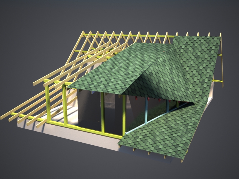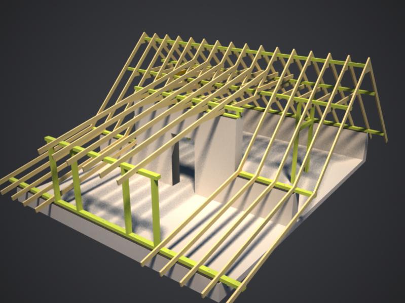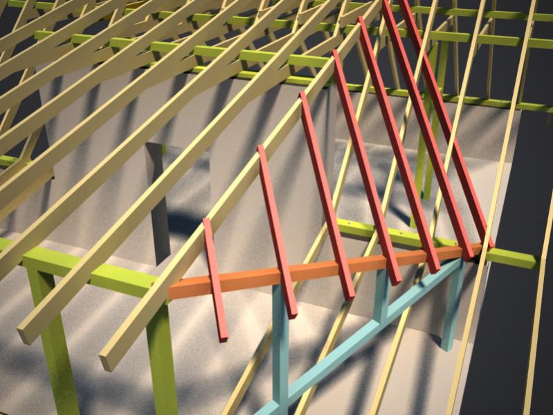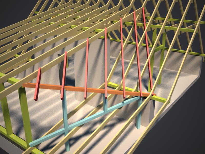 И снова здравствуйте! Приблизились к окончанию возведения стропильной конструкции нашей будущей крыши и.. И как всегда на ходу задумали еще одну штуковину (за что люблю самостройку - рождение идей в процессе, пусть и непрофессионально - зато для души). Ну так вот! Что мы имеем сейчас - рисунок 1. Что мы хотим сделать - рисунки 2-3 (не обращаем внимания на темное пятно - косяк модели, не стал терять время на исправления). После нескольких часов интернетсерфинга и моделирования вот какое конструктивное решение родилось - рисунки 4-5. Уважаемые эксперты и просто форумчане, как всегда прошу оценки реализуемости. Узлы пока во внимание не берем, если норм - их буду продумывать позже. Оранжевые и голубые брусы 100х100. Красные - обычная стропила 50х150. У самого пока наибольшие сомнения по поводу примыкания оранжевого бруса с обеих сторон. Что скажите?