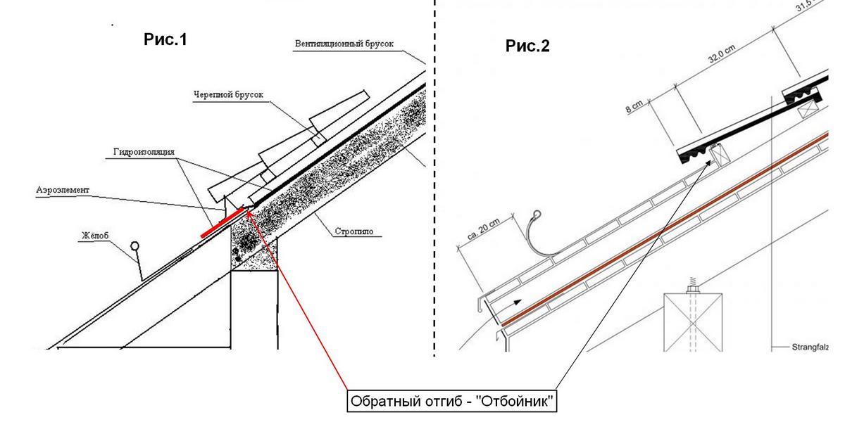 Хорошие рисунки и фото. Но вот на первом фото жёлоб стоит так, что перехватывает воду с гидроизоляции. С чего бы это? Не знаете? А как стоит гидроизоляция на других фото сказать не возможно. Так для чего фото? Для красоты? И видимо вы, как и Клямер не в курсе почему гидроизоляцию на фальцевых кровлях выводят на карниз, а на штучных в жёлоб? И про механизм образования наледей в настенном жёлобе тоже видимо не очень? Жаль.