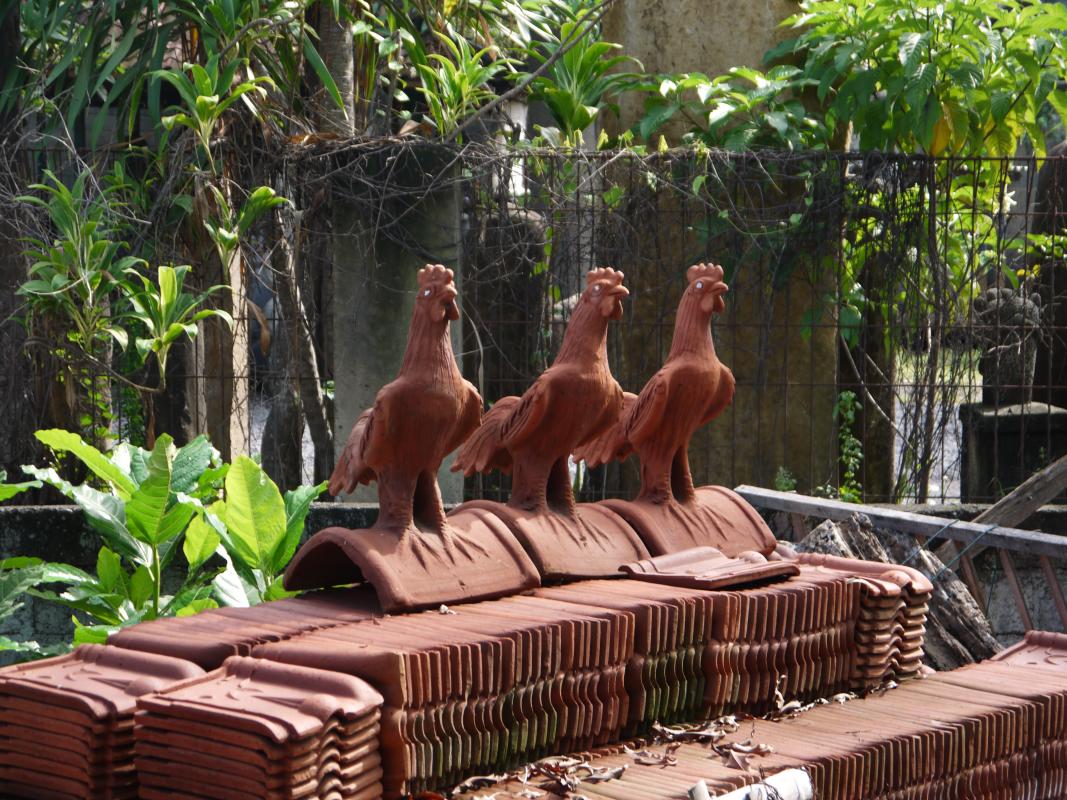 Торговых точек с другими кровельными покрытиями я не видел, только керамика (что очень приятно). Кровельные украшения изготавливают из цемента, занимаются этим семейные артели. Разнообразие украшений достаточно большое. Будет интересно - выложу фото.