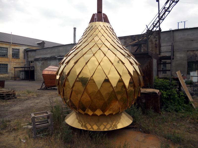 На фото все культурненько выглядет, да еще и медь... и фальц присутствует.... НО шашка плоская... не айс, хотя если высота купола будет далековато от земли... то объем шашки и не увидишь! Хотя смотрю размер шашки не такой уж и большой, значит не высоко будут ставить. Посмотрите что у нас в пензе творят вручную из нитрит-титана на луковицах. Прошу обратить внимание на углы - они закругленные, потому как вручную гнут без станка. Все заказы на Мос.область идут, там все и монтируют ежегодно. Сделано и смонтировано осенью 2010 года.