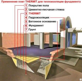 Фундамент представляет из себя основу любого строения, поэтому не должно возникать сомнений в его надежности. Через некачественный фундамент, строение может терять до пятнадцати процентов тепла. Сейчас в строительстве, с целью утепления фундаментов и грунта вокруг фундаментов (для исключения промерзания и пучения грунта), используется теплоизоляция THERMIT XPS. В чем прелесть данного материала? THERMIT XPS - это экструдированный пенополистирол, который не гниет из-за биологического воздействия на него почвы и не впитывает воду.