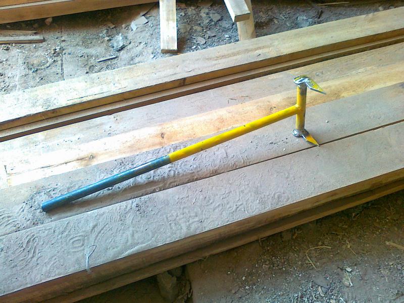 Рычаг 1 м ( труба 32мм), перекладина 0,22 м (почему такой большой зазор ?, а потому что делался под конкретный объект) (труба 32 мм) , зубья выпилены из пластины 8 мм , L=100мм, в них выбрана косыночка для посадки под обрешётину.