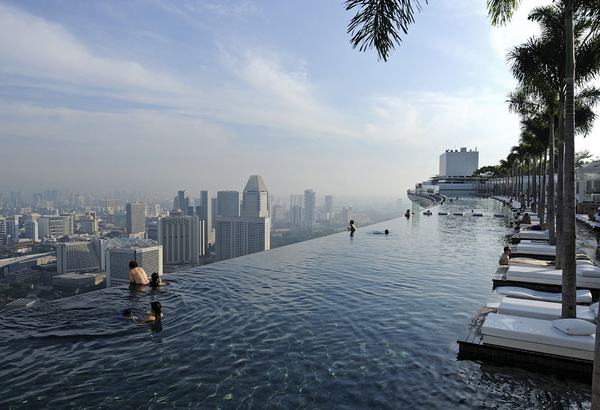 Ну и тут нужно упомянуть про самый крутой отель в мире — Marina Bay Sands в Сингапуре. На трех башнях высотой в 200 метров (55 этажей) располагается огромная терраса в виде гондолы с бассейнами и зелеными садами. Там есть несколько ресторанов, ночные клубы, джакузи и тропический сад. И, конечно же, знаменитый бассейн.