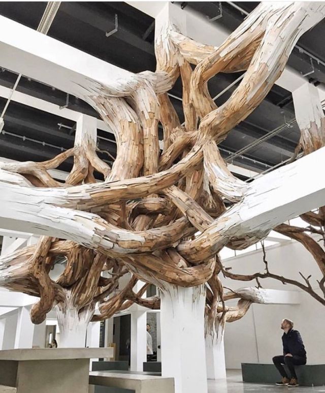 Необычная инсталляция из бруса и выходящих из него переплетенных корней была установлена во дворце Токио в Париже, Франция. Автор: Энрике Оливейра.