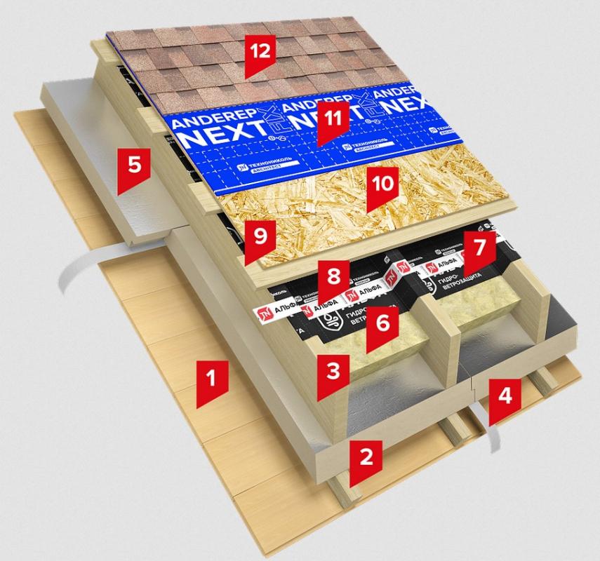 Новинка компании Технониколь – кровельная система ТН-ШИНГЛАС Мансарда Контр PIR создана для того, чтобы с успехом решить эти задачи. ТН-ШИНГЛАС Мансарда Контр PIR - это кровельная система, тепловой контур которой выполнен из комбинированного утеплителя: в межстропильном пространстве заложены лёгкие упругие плиты из каменной ваты типа РОКЛАЙТ, а к нижней поверхности стропильных ног силового каркаса крыши подшиваются термоплиты LOGICPIR PROF. Размер этих плит: длина х ширина: 2400х1200 мм При разработке данной системы удалось добиться максимальной теплотехнической однородности. Слой сформирован таким образом, что его не прерывают стыки с деревянными конструкциями изнутри помещения. Алюминиевая фольга, выступающая в роли обкладки плит LOGICPIR, отражает тепло внутрь помещения. Благодаря этому образуется подобие бытового термоса, наилучшим образом сохраняющего тепло внутри помещения. Применение утеплителя LOGICPIR PROF, облицованного с нижней и верхней стороны алюминиевой фольгой, позволяет отказаться от монтажа пароизоляционной плёнки, т.к. при проклейке стыков плит алюминиевой самоклеящейся лентой LOGICPIR образуется герметичный пароизоляционный барьер, препятствующий проникновению увлажненного воздуха внутрь кровли и дальнейшей конденсации влаги внутри конструкции. Плиты минеральной ваты в межстропильном пространстве препятствуют проникновению акустического шума внутрь помещения снаружи. Эффективно подобранные в результате температурно-влажностного расчета толщины утеплителей помогают сохранить незаполненным вентиляционный зазор в верхней части стропильных ног. Это позволяет исключить из системы контрбрус, традиционно присутствующий в утеплённых скатных кровлях, без ухудшения эффективности кровельной системы. Система ТН-ШИНГЛАС Мансарда Контр PIR предназначена для нового строительства с повышенными требованиями к теплотехнической однородности крыши, а также для реконструкции кровель, в которых было диагностировано повреждение пароизоляционного слоя. • 1 Подшивка из листовых материалов (ГКЛ / ОСП 3 / вагонка) • 2 Деревянные бруски • 3 Стропильная балка • 4 Лента алюминиевая самоклеящаяся LOGICPIR • 5 Плиты теплоизоляционные LOGICPIR PROF • 6 Плиты из каменной ваты ТЕХНОЛАЙТ ЭКСТРА • 7 Пленка ТЕХНОНИКОЛЬ АЛЬФА ТОП • 8 Соединительная односторонняя лента ТЕХНОНИКОЛЬ АЛЬФАБЕНД 60 • 9 Деревянные бруски • 10 Деревянный настил (ОСП-3; ФСФ) • 11 ANDEREP NEXT FIX • 12 Многослойная черепица ТЕХНОНИКОЛЬ SHINGLAS