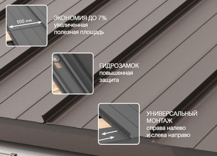 Их самозащёлкивающийся фальц позволяет быстро и легко монтировать панели. Разнообразие профилей даёт возможность выбрать оптимальное решение для различных архитектурных стилей.