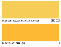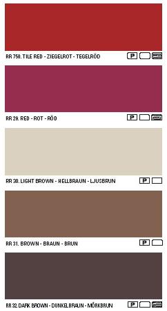белый (RR 20), светло-серый (RR 21), серый (RR 22), темно-серый (RR 23), черный (RR 33), светло-желтый (RR 24), желтый (RR 25, RR 26), красный (RR 29), темно-красный, кирпично-красный (RR 750), светло-коричневый (RR 30), коричневый (RR 31), темно-коричневый (RR 32), светло-зеленый (RR 36), зеленый (RR 37, RR 38), цвет хвои (RR 11), голубой (RR 34), синий (RR 35), серебристый металлик (RR 40), темно-серебряный металлик (RR 41), золотой металлик (RR 42), медный металлик (RR 43), голубой металлик (RR 44)