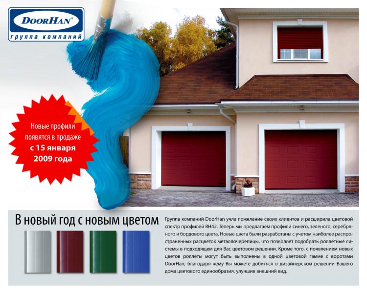 В новый год с новым цветом.Группа компаний DoorHan учла пожелание своих клиентов и расширила цветовой спектр профилей RH42. Теперь мы предлагаем профили синего, зеленого, серебрянного и бордового цвета. Новые цвета были разработаны с учетом наиболее распространенных расцветок металлочерепицы, что позволяет подобрать рольставни и рольворота в подходящем для Вас цветовом решении. Кроме того, с появлением новых цветов, роллетные системы могут быть изготовлены в одной цветовой гаме с воротами DoorHan, благодаря чему Вы можете добиться в дизайнерском решении Вашего жилища цветового единообразия, улучшив внешний вид. Новые профили появятся в продаже с 15 января 2009 года.