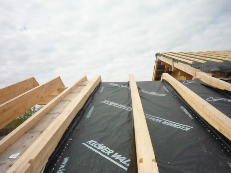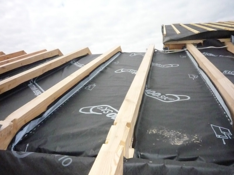 1. парик закреплен обратной стороной - правильно производить монтаж надписью к себе (к лицу). 1.1. На некоторых фото непонятна укладка парика - он выполнен как в случаях реконструкции, т.е. пленка укладывается между двух стропил с выпусками наружу! о как! зачем так надо было делать, если объект идет под новое строительство? чудно ![]() 1.2. Необходимо проклеить стыки нахлестов парика кровельным скотчем, например D-TACK Tacoflex, KLOBER Permo TR, DELTA Multi-Band. 1.3. Необходимо проклеить скотчем все нахлесты париков и дифки к вертикальным поверхностям! Если не понятно укажу на фото стрелками. 2. Шаг стропил.... суперский... такого даже я еще не видел... у вас шаг по 200 мм между стропил? Мы делаем от 700 до 1000 мм. Зачем так часто надо было делать? чудно! много денег у вас свободных на оплату дров и их монтажа? ПС. За применение КЛЕБЕРА респект кровелям! |