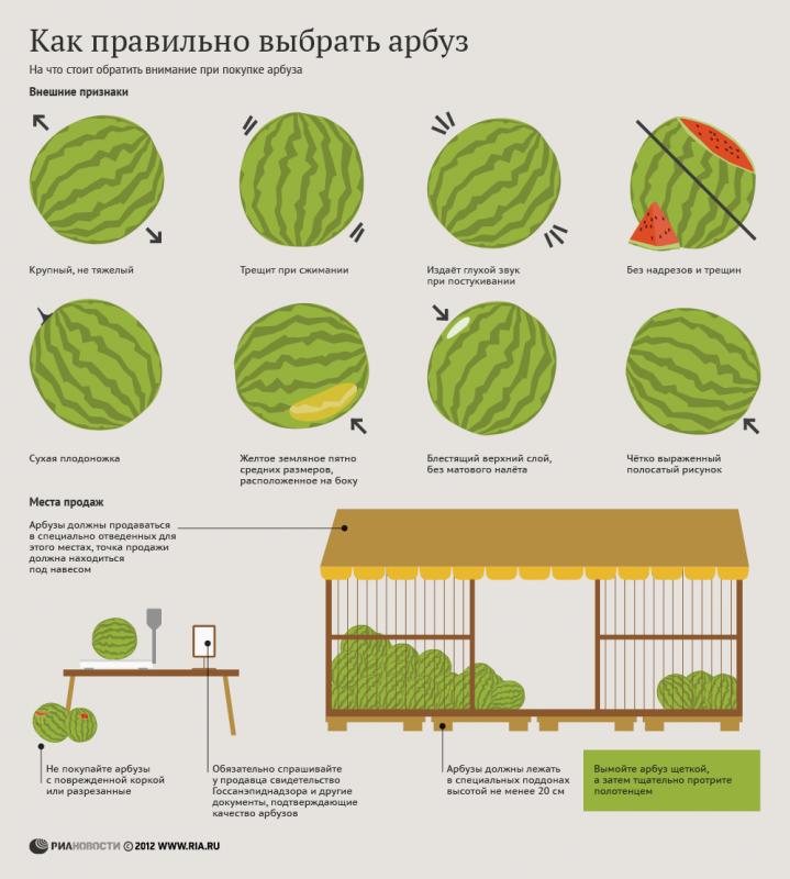 Выбирая арбуз, лучше остановиться на довольно крупной и легкой ягоде. Небольшие и, наоборот, гигантские плоды, вероятнее всего, не дозрели или перекормлены нитратами. Хвостик у понравившегося арбуза должен быть сухим, пятно на боку – ярко-желтым, а еще лучше оранжевым, корка – твердой, блестящей и максимально контрастной расцветки.
