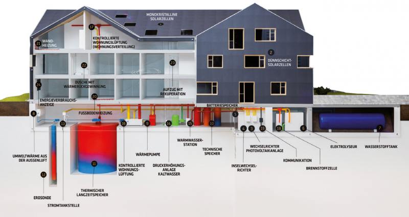 Многоквартирный, на девять семей, «Дом будущего» площадью 1000 м2 построен в предместье Цюриха в местечке Brütten. Квартиры в автономном доме сданы в аренду, уже есть первые отзывы арендаторов.