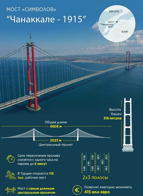 · Мост Чанаккале 1915 года сокращает время в пути между двумя берегами до 6 минут на машине вместо полутора часов, которые раньше требовались для пересечения судов.