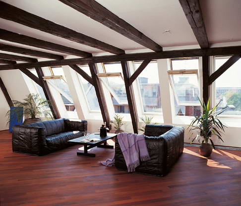 Для превращения чердака в мансарду требуется комплекс не слишком сложных работ. В первую очередь встает вопрос о том, как впустить в помещение дневной свет. Вариантов всего два: соорудить над кровлей блоки для слуховых окон, либо прямо в нее врезать мансардные. Но дополнительные конструкции «слуховичков» на крыше могут нарушить архитектурный облик здания, да и обходятся они заметно дороже, чем «гладкие» мансардные решения. Еще один аргумент в пользу мансардных окон – их большая (по сравнению с традиционными фасадными) эффективность. Света, проходящего сквозь вертикальное окно с площадью стекла 1 кв.м, хватает лишь на восемь «квадратов» помещения, тогда как одного квадратного метра мансардного остекления достаточно для освещения 10 кв.м. Высоту расположения мансардных окон в каждом случае определяют индивидуально. Рекомендации простые: проемы «в потолке» позволяют эффективно осветить центр помещения, однако совершенно бесполезны с точки зрения панорамного вида. Чтобы сидящий в кресле человек мог спокойно любоваться пейзажем, окно должно начинаться в 90-110 см от пола.