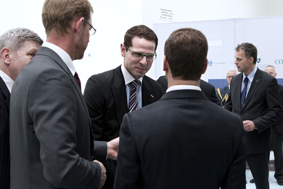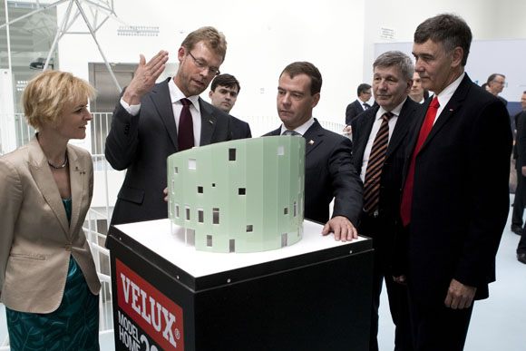 Во время посещения здания "Зеленый маяк" президент России Дмитрий Медведев познакомился с генеральным директором ЗАО "ВЕЛЮКС" Миком С. Расмуссеном.