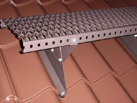 Стандартная высота перил 1100 мм. Для перехода вдоль ската на пологих крышах (менее 8%) вместо кровельной лестницы можно использовать кровельный мостик. Из кровельных трапов можно собрать также разные рабочие площадки и ступеньки.