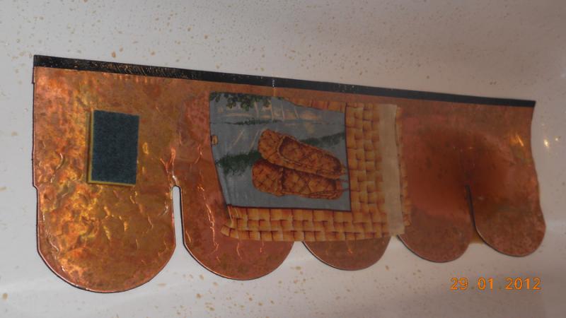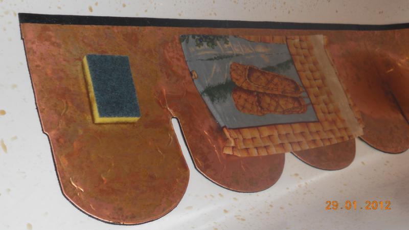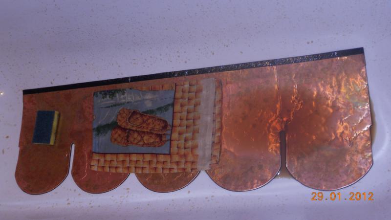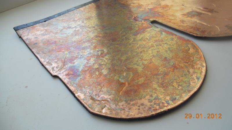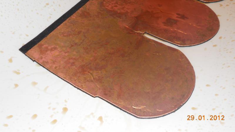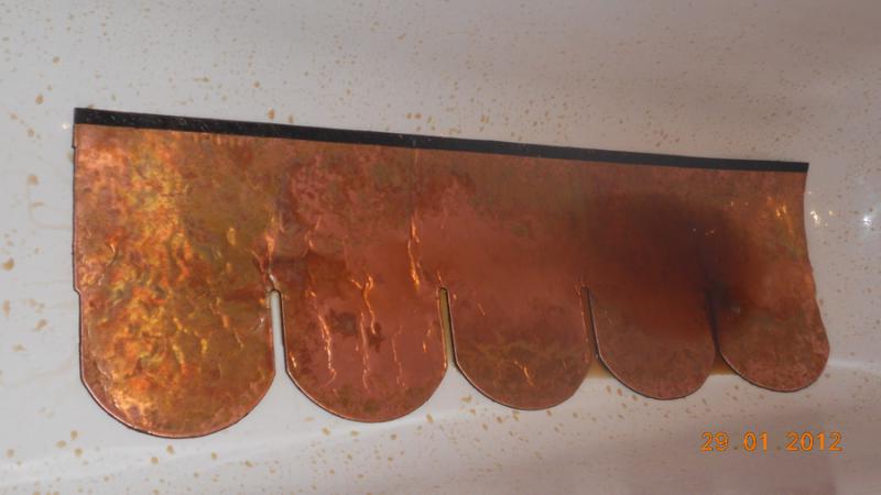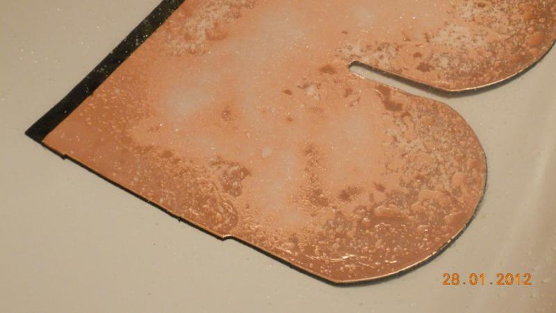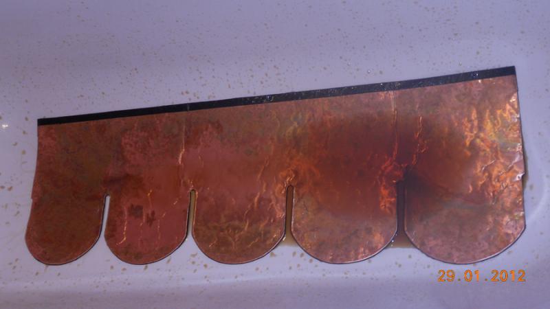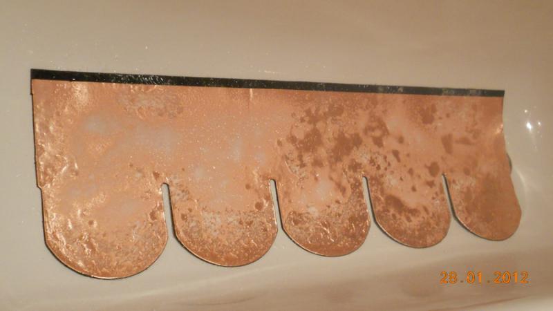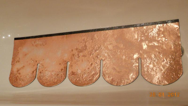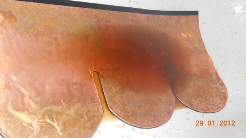 Окончание эксперимента с солью. Дата 29.01.2012. Время 11:00. Визуально наблюдался большой процесс окисления площади медной фольги в тех местах, где толщина покрова соли была минимальной. Как видно на фоторегистрации правая часть гонта была покрыта большим слоем соли, поэтому окисление в данной части отсутствует.