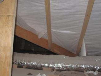 Вывод: это приведет к попаданию атмосферных осадков, влаги в подкровельное пространство и жилую зону. 17.Пленка в районе ендов уложена в два слоя (рис. №17, № 17а) Вывод: гидроизоляция, уложенная в два слоя, в ендовах является недостаточной мерой для полной герметичности подкровельного пространства. 18.На чердачном перекрытии в нескольких местах утеплитель скомкан и имеет недостаточную толщину (рис. №18, № 18а) Вывод: это приведет к излишним потерям тепла и образованию мостиков холода. 19.Гидроизоляционная пленка не доходит до окончания стропильных ног (рис. №19, № 19а) Вывод: при такой укладке гидроизоляционной пленки влага, снег, попавший в подкровельное пространство, будет попадать на утеплитель, что не допустимо. |