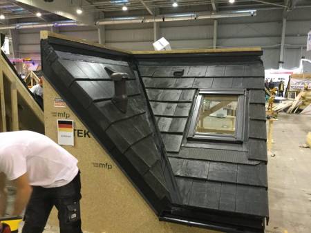 Номинация керамическая черепица. Как и накануне работали с плоской моделью черепицы и устанавливали мансардное окно, но на этот раз выполняли ендову и монтировали вентиляционные выходы.