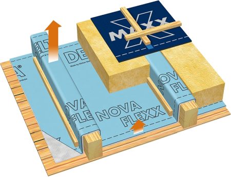 Эта плёнка предназначена для санации крыш с внешней стороны и для нового строительства крыш в деревянных и каркасных домах, где отсутствуют или проводятся минимальные «мокрые» отделочные работы по заливке стяжек полов. DELTA®-NOVAFLEXX состоит из двух слоёв:
