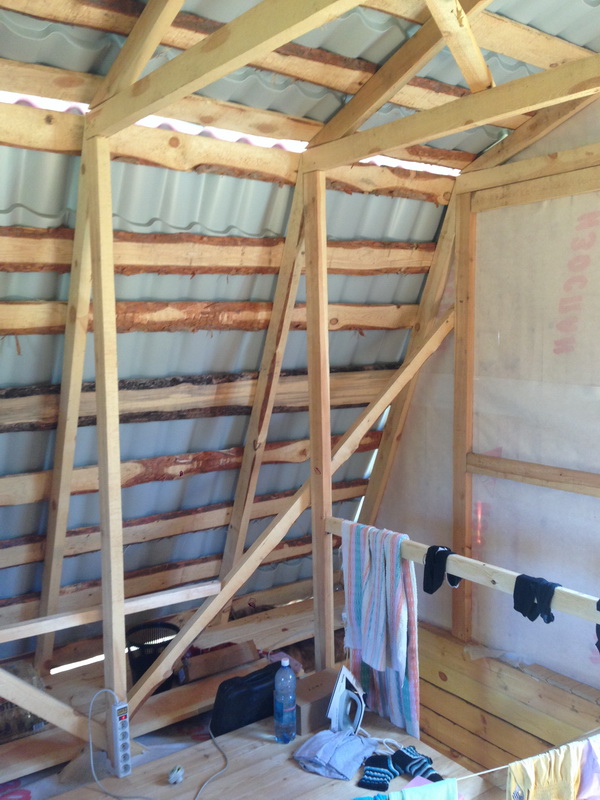 Мансардный этаж 6 на 6. Кровля УЖЕ лежит на несплошной обрешетке, без контррейки и без ветро влаго защиты. Стропила 100 на 50. Изначально этот дом планировался для проживания весна-лето-осень до -10 градусов + на выходные. Сейчас так не охота возвращаться в квартиру, что задумался о постоянном проживании.