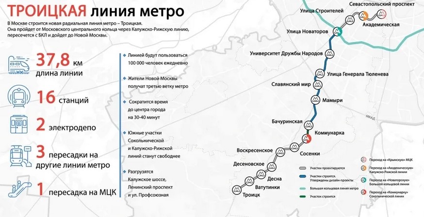 В Москве ведется строительство станций на центральном участке Троицкой линии. Эта ветка длиной 40 км соединит платформы Московского центрального кольца с Троицком. Около новых станций метро проживают около миллиона человек. Открытие новых станций метро позволит снизить нагрузки на автомобильные дороги.