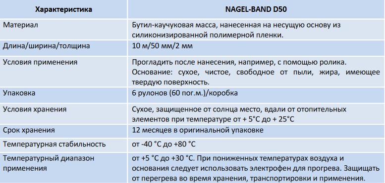 Компания Doerken представили новую уплотнительную ленту из бутил-каучука для контробрешётки — NAGEL-BAND D50. Данная уплотнительная лента имеет ширину 50 мм и толщину 2 мм -подходит для контробрешетника 50х50 мм. NAGEL-BAND D50 наклеивается на подкровельную плёнку и с усилием прокатывается металлическим, пластиковым или резиновым роликом. После этого монтируется контробрешетник с шагом крепления гвоздями/шурупами не более 33 см (шаг зависит от угла наклона крыши, ветровой нагрузки в регионе и массы кровельного материала). NAGEL-BAND D50 обеспечивает наибольшую надёжность от протечек в местах перфорации плёнки гвоздями/шурупами. Лента подходит для конструкций как со сплошным настилом, так и без настила. NAGEL-BAND D50 герметизирует отверстия в плёнке даже при монтаже по сплошному настилу из обрезных досок, имеющих разную толщину. Основание должно быть чистое, сухое, свободное от пыли и жира, имеющее твердую поверхность. Важно! После нанесения на плёнку и прокатки роликом лента не может быть демонтирована. При попытке удалить ленту, это может привести к повреждению подкровельной плёнки. Материал ленты — клеящий и герметизирующий слой из бутил-каучука, основа — лента из силиконизированного полиэтилена.
