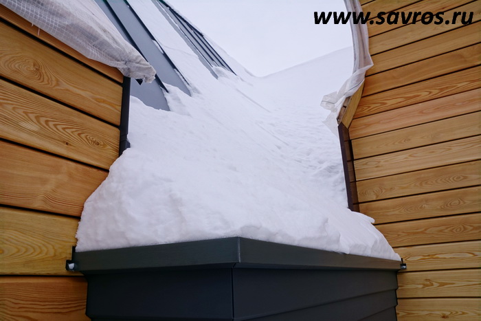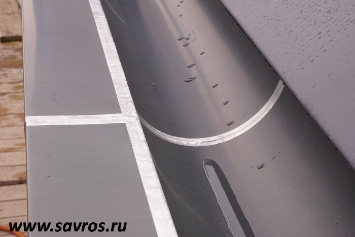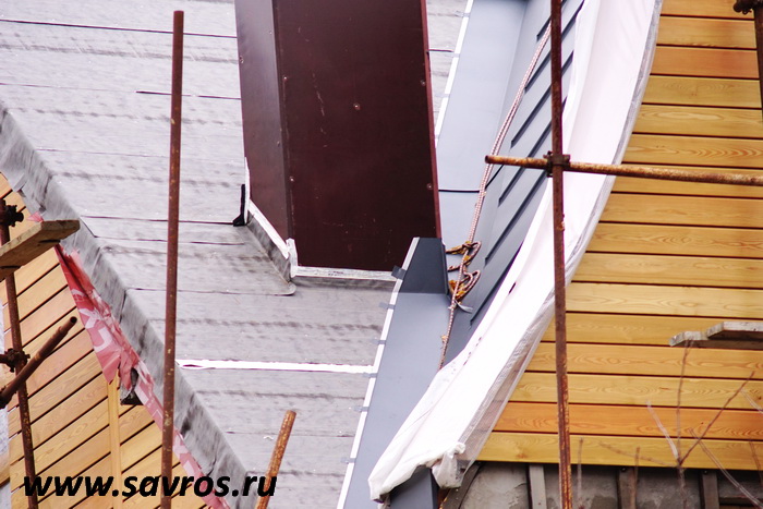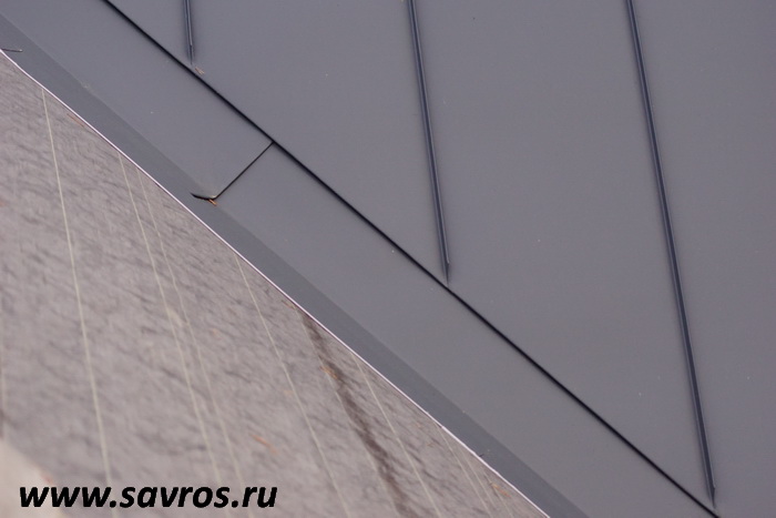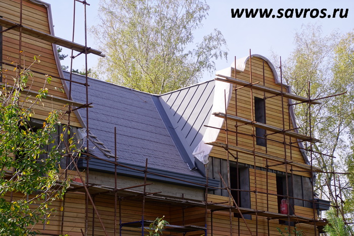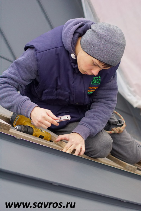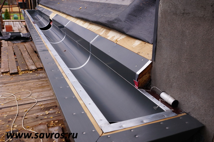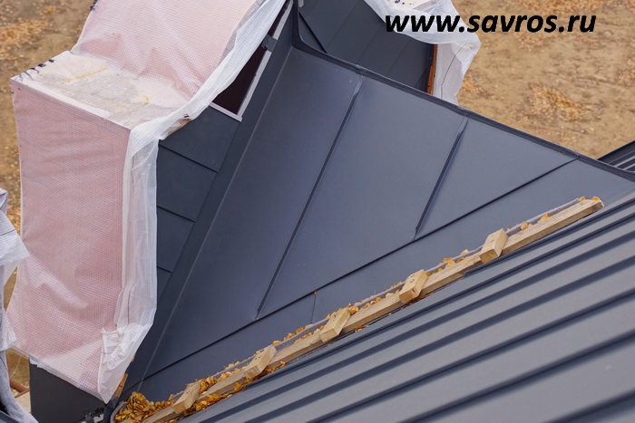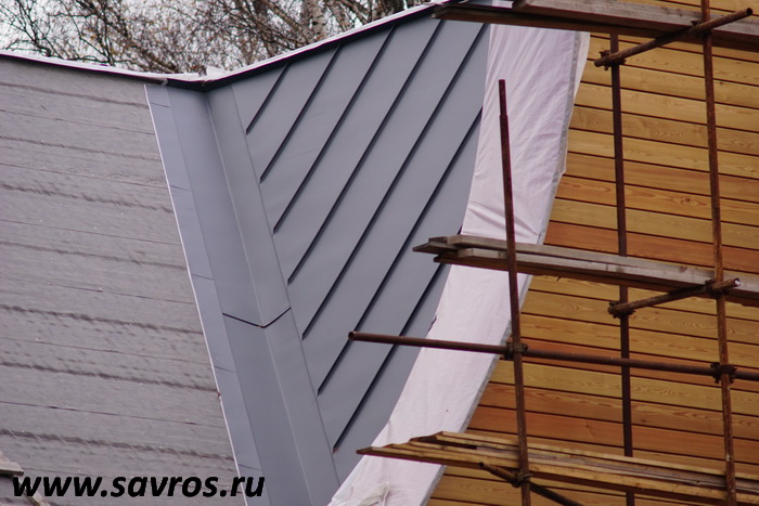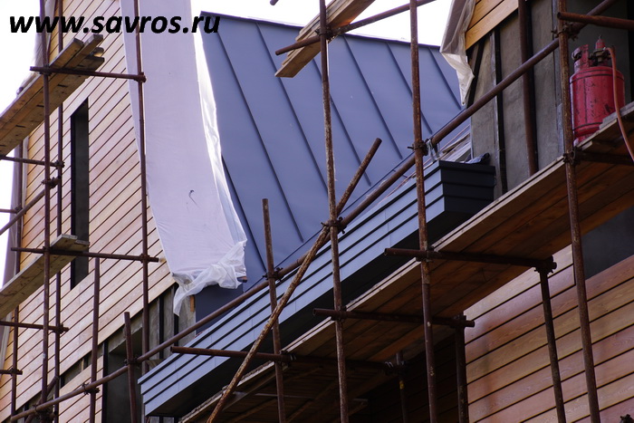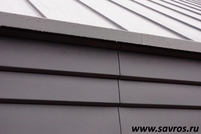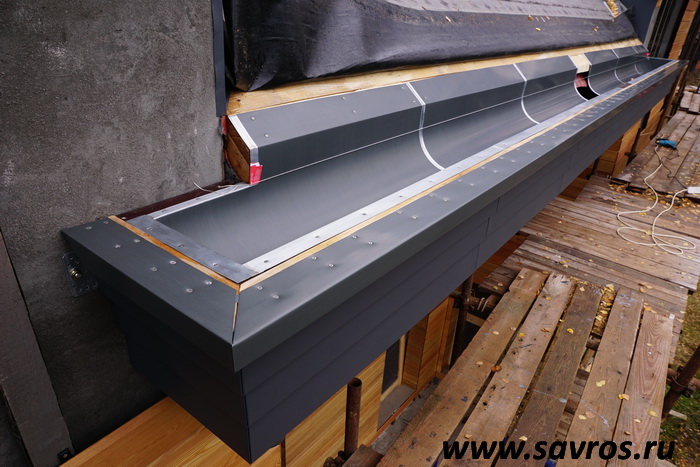 Кровля окрыта сталью с покрытием (видимо,Пурал?),а объемные карнизы/желоба из титан-цинка? Офигенская,кстати,идея,с этими карнизами-желобами,с подвесными желобами не было бы такого эффектного внешнего вида.
